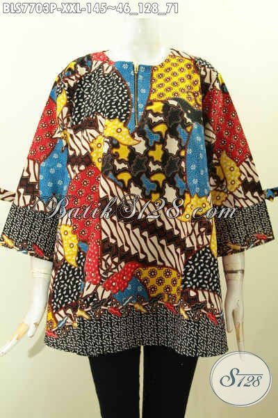 Sedia Baju Batik Modis Online, Pakaian Batik Blus Resleting Depan Pakai Pita Kwalitas Istimewa Proses Printing, Spesial Untuk Wanita Gemuk [BLS7703P-XXL]
