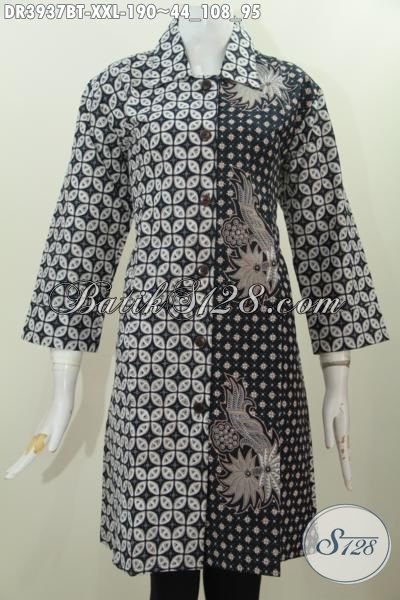 Sedia Batik Dress Modis Terkini Ukuran Jumbo Model Kerah Lancip Kombinasi Tulis Berpadu Motif Elegan Yang Bikin Penampilan Wanita Gemuk Tambah Stylish [DR3937BT-XXL]