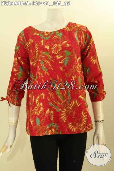 Sedia Busana Batik Atasan Untuk Wanita Muda, Blus Batik Warna Merah Desain Kancing Belakang Dan Bertali Di Bagian Lengan, Bikin Penampilan Cantik Menawan [BLS8494P-M]