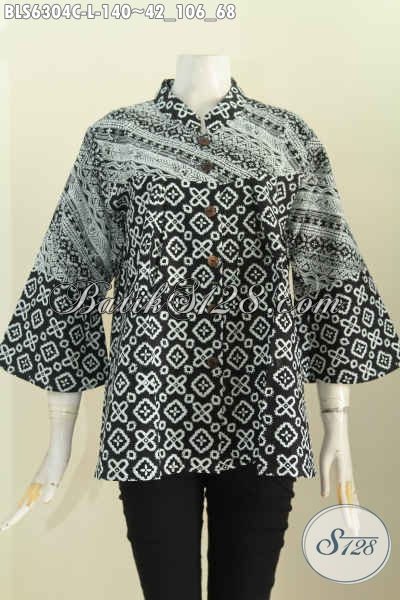 Sedia Busana Batik Terbaru Untuk Wanita Masa Kini, Produk Pakaian Batik Modis Model Kerah Shanghai Bahan Halus Warna Monokrom Proes Cap [BLS6304C-L]