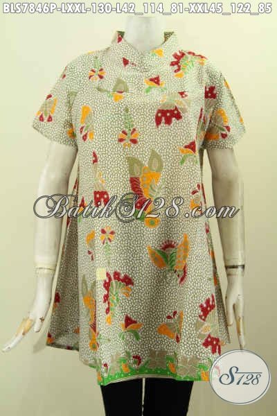 Seragam Kerja Batik Elegan Kerah Shanghai, Baju Batik Lengan Pendek Wanita Masa Kini Motif Unik Proses Printing Harga 130K [BLS7846P-L , XXL]