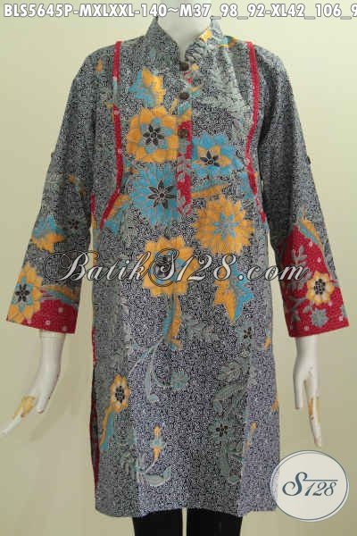 Toko Baju Batik Online, Sedia Blus Batik Muslim Kerah Shanghai Kwalitas Halus Motif Mewah Proses Printing Hanya 140 Ribu Model Lengan Panjang [BLS5645P-M , XL , XXL]
