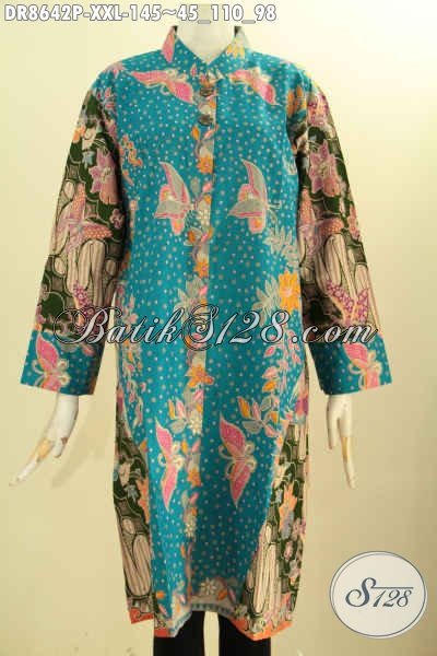 Toko Baju Batik Online Terlengkap, Sedia Tunik Batik Dress Wanita Gemuk Kerah Shanghai Lengan 7/8 Kancing Depan, Bahan Halus Motif Bagus Warna Berkelas, Spesila Untuk Wanita Gemuk Tampil Mempesona [DR8642P-XXL]
