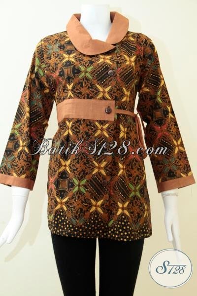 Toko Batik Online lengkap Murah Terpercaya, Jual Blus Batik Wanita Model Terkini Warna Coklat Elegan Berpadu Motif Unik Terkini [BLS1459BT-M]
