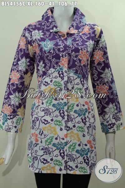 Toko Busana Batik Fashion Online, Jual Blus Batik Kerah Bulat Warna Ungu Motif Bunga Proses Cap Size XL Cocok Buat Wanita Dewasa Tampil Labih Gaya [BLS4156C-XL]