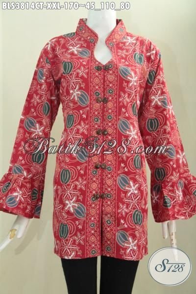 Toko Busana Batik Online, Sedia Blus Batik Kerah Shanghai Berpadu Warna Merah Keren Dan Motif Paling Baru Menunjang Penampilan Wanita Gemuk Semakin Berkelas [BLS3814CT-XXL]