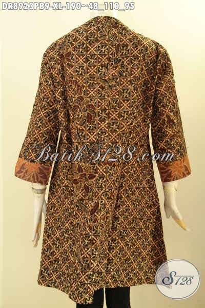 Toko Online Aneka Busana Batik Solo, Sedia Dress Lengan 3/4 Motif Klasik Kwalitas Premium, Baju Batik Printing Kerah Langsung Dengan Aksesoris Di Bagian Dada Kanan Kiri, Cocok Buat Ngantor Atau Kondangan [DR8923PB-XL]
