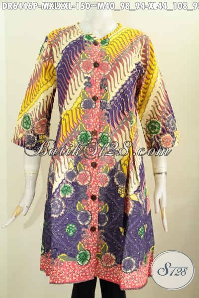 Toko Online Pakaian Batik Terlengkap, Sedia Dress Batik Halus Motif Mewah Printing Model Tanpa Krah Kancing Depan, Modis Untuk Ke Kantor [DR6446P-M , XL , XXL]