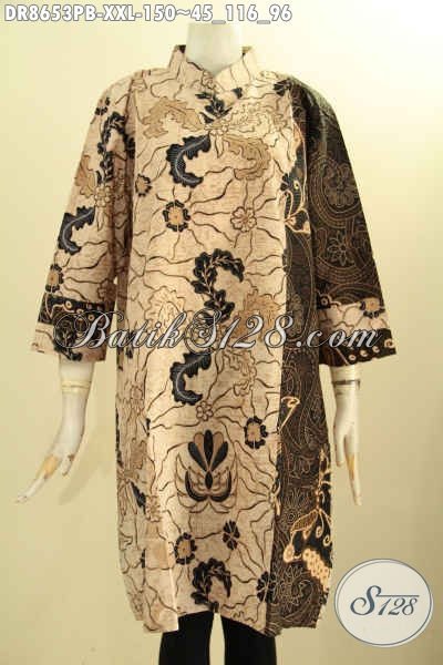 Tunik Batik Dress Big Size, Busana Batik Wanita Gemuk Lengan 7/8 Dengan Saku Dalem, Pakaian Batik Kerah Shanghai Resleting Belakang, Cocok Buat Kondanga Dan Kerja [DR8653PB-XXL]