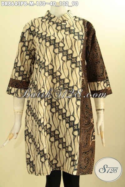 Tunik Batik Dress ELegan Motif Klasik, Busana Batik Kerah Shanghai Resleting Belakang Lengan 7/8 Di Lengkapi Saku Di Bagian Dalam Sebelah Kanan Hanya 150K [DR8643PB-M]