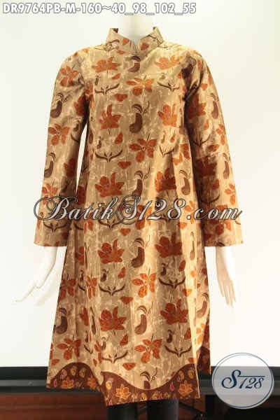 Tunik Batik Modern Khas Solo Jawa Tengah, Busana Batik Kekinian Model Kerah Shanghai Pakai Resleting Belakang Lengan 7/8, Motif Terkini Untuk Penampilan Cantik Dan Anggun [DR9764PB-M]